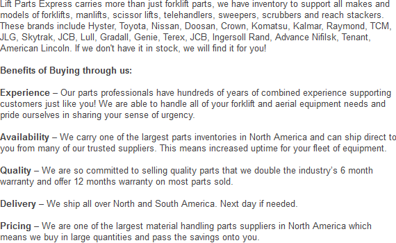 We have great prices on all our forklift parts. Phone today to get a quote on one of the parts or attachments we offer. Call us at: